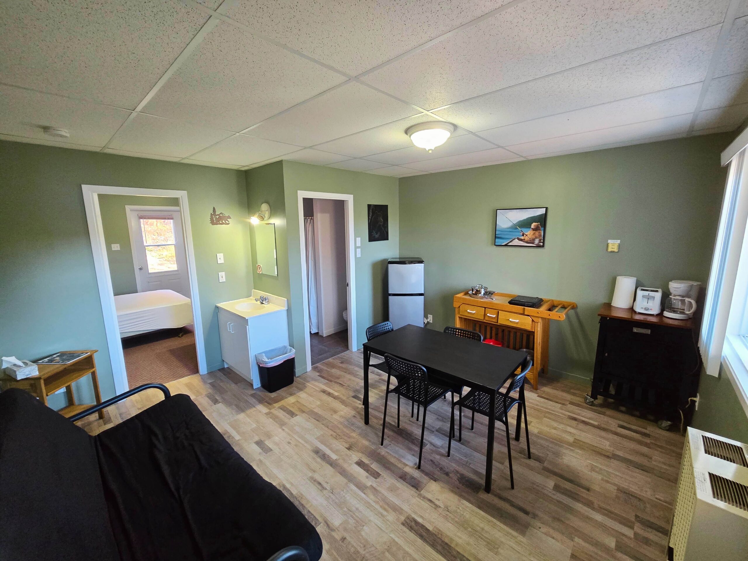 Situé au 1er étage du pavillon, ce studio peut accueillir jusqu’à 3 personnes (1 lit double, 1 lit simple et un divan-lit, literie non incluse). Vous y trouverez toutes les commodités nécessaires pour un séjour agréable : une salle de bain avec douche, un réfrigérateur, plaques de cuisson, articles de cuisine, un BBQ au propane et une petite table extérieure de style bistro. Une entrée située à l’arrière, au niveau du sol et accessible en voiture, facilite l’accès à l’unité. Depuis l’unité, vous pourrez également profiter d’un magnifique panorama sur le lac, un cadre paisible pour savourer chaque moment de votre escapade.